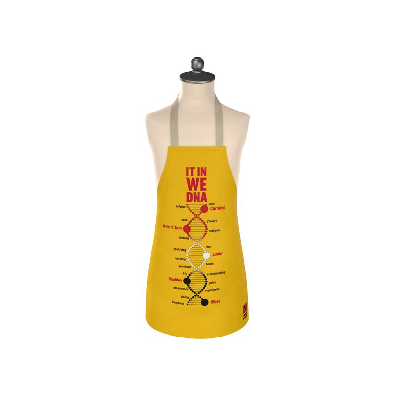 This bright yellow apron, inspired by Mical Teja's hit song "DNA," proudly showcases the essence of Trinidad & Tobago with its bold red, white, and black design. The design celebrates the nation's spirit. "It in we DNA" is emblazoned across the front, echoing the song's powerful message of national identity and unity. It is accompanied by a DNA symbol which highlights some of the things that are quintessentially Trinbagonian. Perfect for any culinary occasion, this apron embodies the heart and soul of T&T, making it a must-have for any Trinbagonian kitchen.