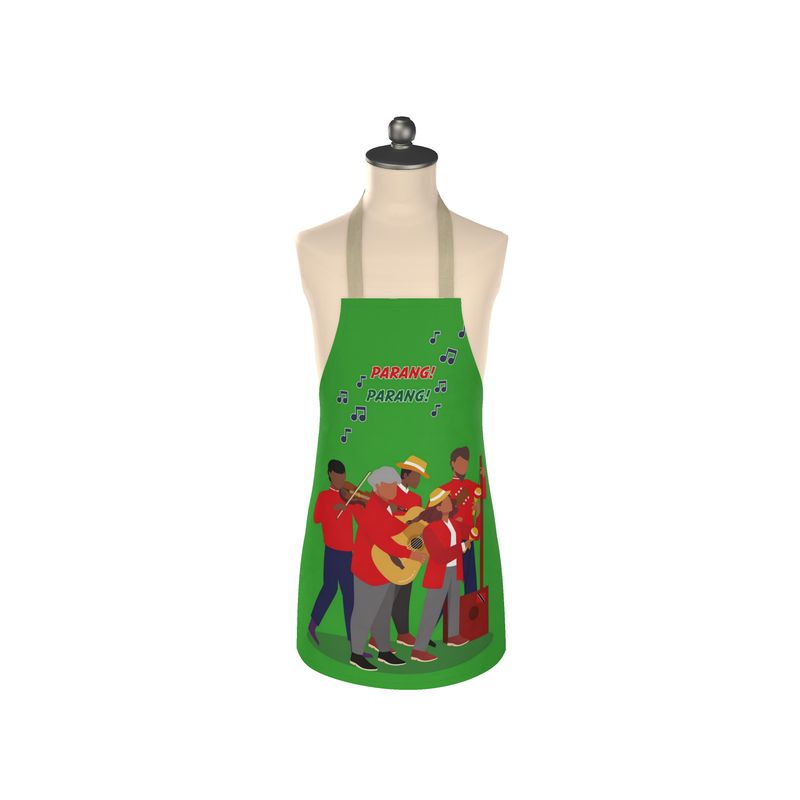 Parang! Parang! is what they sang... This festive kitchen apron pays tribute to the parranderoes of Trinidad & Tobago, who bring Christmas joy by singing traditional parang from house to house. Parang, with roots in Venezuela, was embraced by the twin isles of Trinidad & Tobago, blending Spanish lyrics with vibrant rhythms. Originally sung by small groups during the holidays, paranging has become a beloved tradition, spreading cheer and community spirit. With bright, festive designs, this apron captures the joy of those musical journeys—perfect for bringing a touch of Christmas magic to your kitchen.