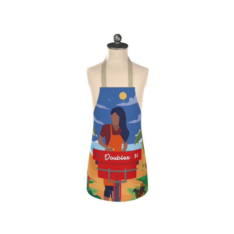This fun, boldly coloured apron showcases a beach scene featuring the Doubles Woman. Doubles, the beloved street food in Trinidad & Tobago, consists of two fried Bara (flatbreads), filled with Channa (a seasoned lightly curried chickpea), topped with chutneys and pepper sauce. It's a flavourful symbol of the island's Indian heritage. The Doubles Vendor is a cherished part of our communities and integral to Trinbagonian culture.